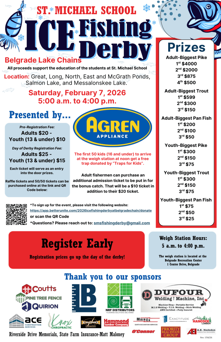 END OF DAY CEREMONY: The ceremony will be AT THE BELGRADE RECREATION CENTER ON GREAT POND. Aaron Quintal will be announcing the winners of the derby.