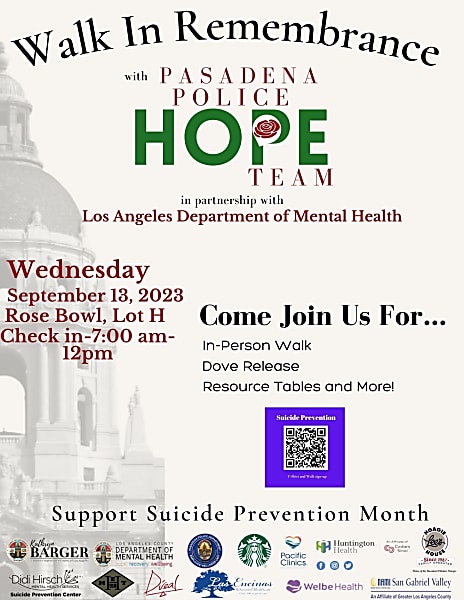 Please join us for a Walk In Remembrance with Pasadena Police HOPE Team in partnership with LA County Department of Mental Health.