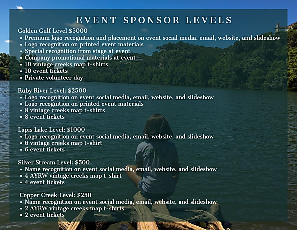 If you are interested in giving back and supporting our mission by becoming a sponsor for this event, please contact Jamie Green via email at jamie@riverwatchers.org or call (210) 232-7367 for more information. Sponsor levels and benefits are listed to the right and in the image below.