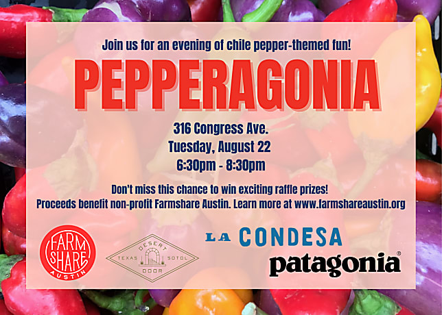 Join us for an evening of chile pepper-themed fun for Pepperagonia, a community-building and educational event hosted by Patagonia Austin in support of Farmshare Austin, a non-profit 10-acre organic farm in Eastern Travis County! Save the date for Tuesday, August 22nd, from 6:30pm to 8:30pm, and experience a free gathering featuring delicious drinks, small bites and sample a variety of sweet and hot peppers from Farmshare. Explore the world of peppers with speakers Michelle Akindiya from Farmshare Austin and Chef Rick Lopez from La Condesa, as they discuss the history and sustainable potential of peppers. Don't miss out on this flavourful event to connect, learn and celebrate all things peppers! It's going be a hot one!