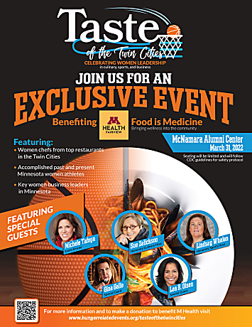 Taste of the Twin Cities will be kicking off the inaugural event Thursday, March 31 at the McNamara Alumni Center. This event is a strolling food event highlighting prominent women leaders in culinary, sports, and business in the Twin Cities. All proceeds for the evening will benefit M Health Fairview Food is Medicine program.