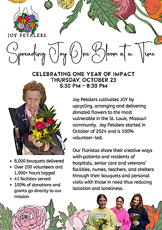 Since October 2024, our 100% volunteer-led nonprofit has delivered more than 8,000 upcycled floral bouquets to over 41 facilities across the greater St. Louis and St. Charles communities. We're on track to do over 10,000 by October 2025! From long-term care and memory care to hospice, cancer infusion centers, veterans, nurses and teachers in St. Louis Public Schools, our mission is simple: bring comfort, joy, and connection one bouquet at a time.