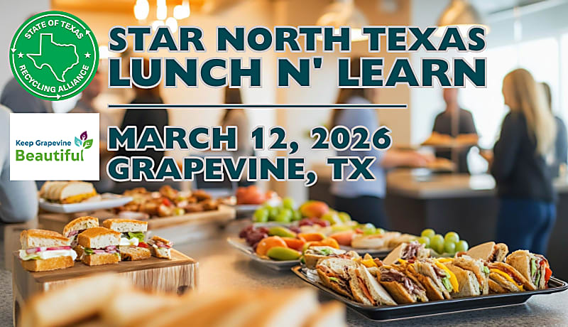 Join the State of Texas Alliance for Recycling (STAR) and Keep Grapevine Beautiful for an engaging North Texas Lunch & Learn focused on real-world recycling solutions in action. This in-person event brings together industry leaders, practitioners, and decision-makers to explore innovative approaches to electronics recycling, food waste diversion, and emerging research shaping the future of materials management.