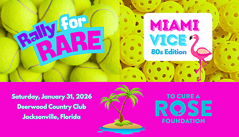 Be part of the inaugural Rally for Rare at Deerwood Country Club in Jacksonville, Florida on Saturday January 31, 2026 — an unforgettable community event benefiting To Cure A Rose Foundation. This exciting Miami Vice — '80s Edition event brings players, friends, and sponsors together for a lively tennis and pickleball round-robin style tournament with a catered lunch, open bar, DJ entertainment, silent auction, raffle games, prizes and more— creating a fun-filled day with life-changing purpose.