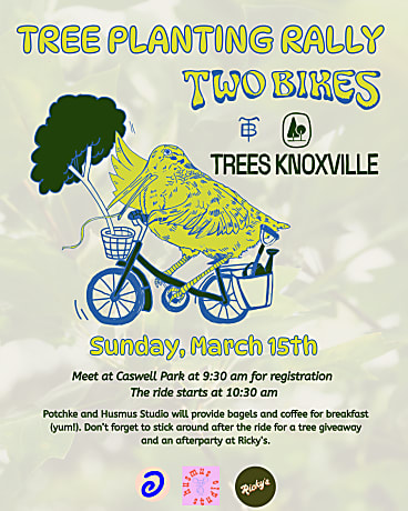 Trees Knoxville and Two Bikes are partnering up for a TREE PLANTING RALLY. How’s that work, you’re wondering? It’s un-be-leaf-ably simple: Gather a team (or ride solo) and branch out across town to plant, water, and learn about local trees. You’ll receive a Tree Passport with a list of locations and activities like prepping a root ball, digging a hole or tree identification. At each stop, a volunteer will stamp your Passport. Stops can be completed in any order.