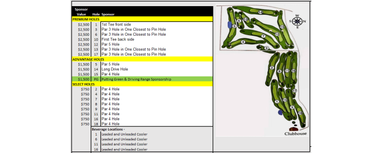 Sponsor Sign - Includes 2 coolers staged at each Tee Box 1, 3, 6,10,14,16. Carts will include 2 bottles of water and snacks.